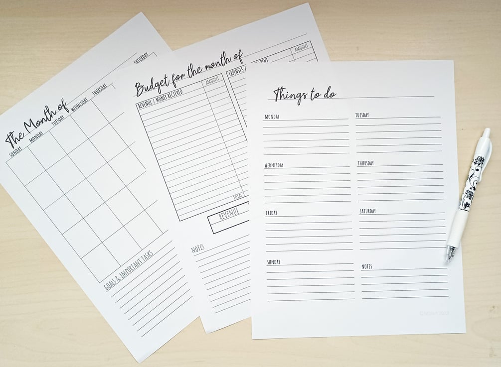Simple black and white design. Make it fun with your favorite colorful pens, markers, stickers, and washi tape! Be sure to get a folder and keep all of your pages together in one easy-to-access location.